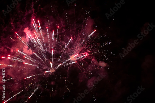 Festive background explosion of fireworks and red smoke.