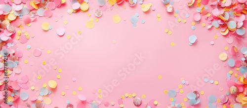 Festive background in soft pink with colorful confetti for text placement Flat lay view from above with a copyspace image
