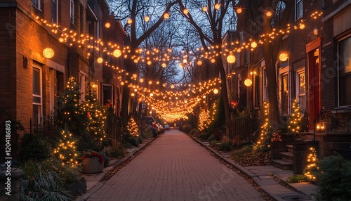 Festive, brick street at night adorned with warm, glowing string lights and illuminated trees.