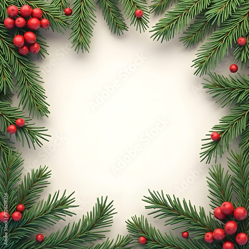 Festive card surrounded by evergreen branches and red berries on a light background.