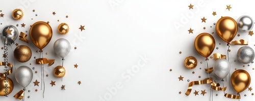 Festive celebration scene with golden and silver balloons, stars, and ribbons on a clean background, perfect for party themes.