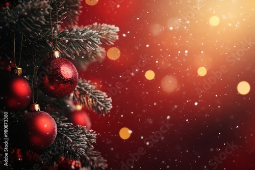 Festive Christmas background. Sparkling red balls on the Christmas tree, blurred bokeh lights.