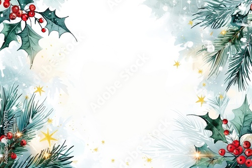 Festive Christmas background with holly and pine branches, perfect for holiday greeting cards and seasonal designs.