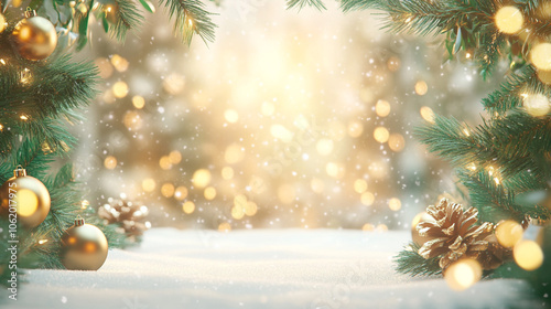 Festive Christmas Background with Pine Branches Ornaments and Snow