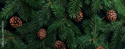 Festive christmas background with pine branches and cones on dark backdrop, perfect for winter holidays. Simple design ideal for cards or banners. Plenty of copy space for your message
