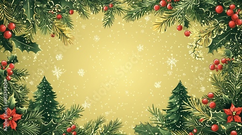 Festive Christmas Background with Pine Branches, Berries, and Snowflakes Creating a Cheerful Holiday Atmosphere for Creative Projects and Celebrations