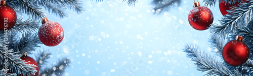 Festive Christmas Background with Red Baubles and Frosted Pine Branches