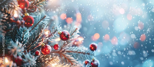 Festive Christmas banner with a winter-themed widescreen background featuring a decorated Christmas tree against a backdrop perfect for a copy space image.