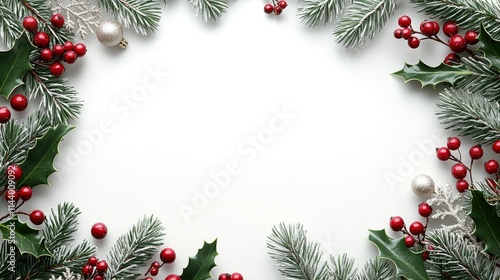 Festive Christmas Border Frame with Holly Berries, Pine Branches, and Silver Ornaments on White