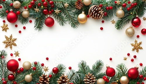 Festive Christmas Card Design with Space for Custom Text Featuring Fir Branches, Red Ornaments, and Pine Cones