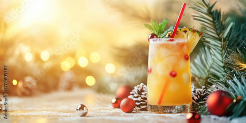 Festive Christmas cocktail with pineapple and coconut, decorated with red ornaments and fresh mint, served on tropical beach table with palm trees ,bright daylight, holiday vacation banner, copy space