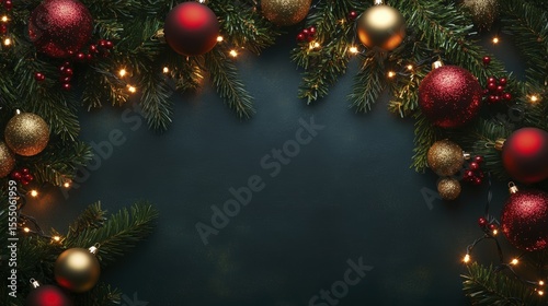 Festive Christmas decorations on dark background with ornaments and pine branches arrangement