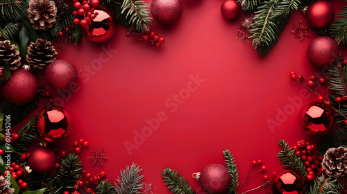 Festive Christmas Frame with Ornaments and Fir Branches on Red Background