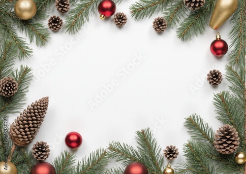 Festive Christmas Frame with Pine Branches, Cones, and Ornaments on White Background