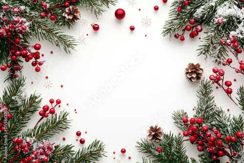 Festive Christmas Frame with Pine Branches, Red Berries, and Pine Cones Perfect for Holiday Themes and Seasonal Greetings