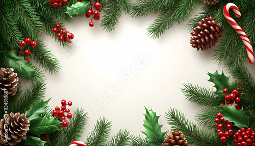 Festive Christmas frame with pine, holly, berries, and candy canes on white background.