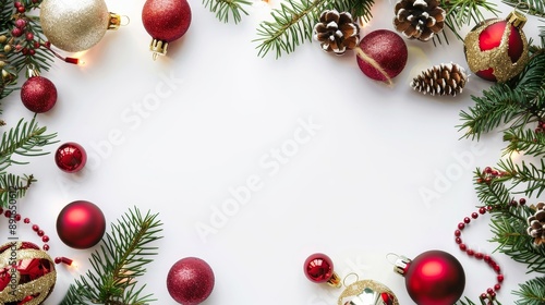 Festive Christmas Frame with Spruce Branches, Red and Gold Decorations on White Background. New Year Lights and Copy Space for Holiday Greetings. Flat Lay Design Concept