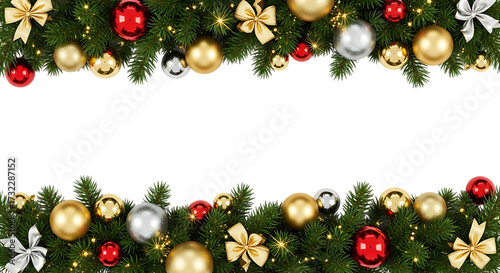Festive christmas garland border with golden silver red baubles and bows on black background with copy space