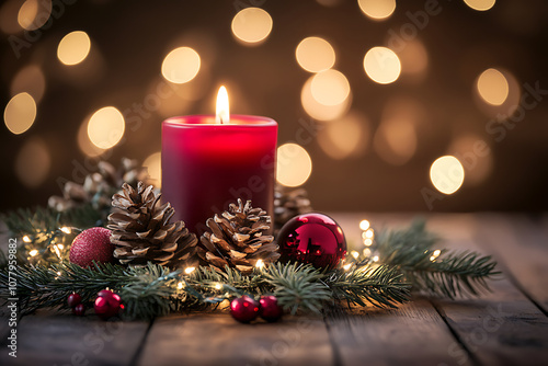 Festive Christmas ornaments and glowing candles set against a bokeh backdrop.