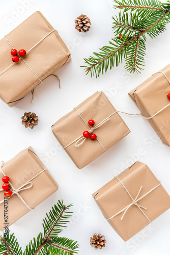 Festive Christmas Presents Background with Rustic Wrapping Paper, Pinecones, Red Berries, and Evergreen Foliage - Ideal for Holiday Copy Space and Seasonal Design Projects