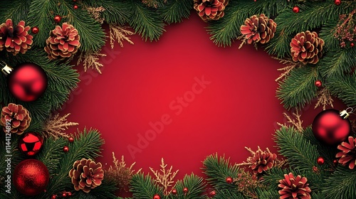Festive Christmas red background with pine branches, cones, and ornaments.
