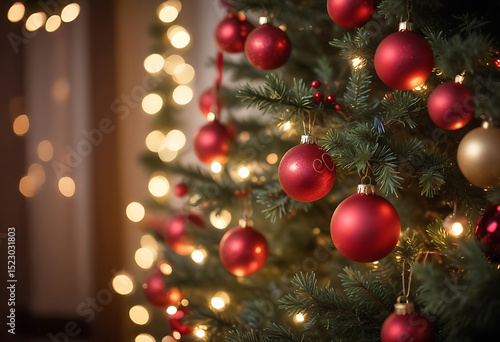 Festive christmas tree adorned with red ornaments and glowing warm fairy lights