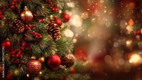 Festive christmas tree decorated with red ornaments and pine cones shines in a warm indoor setting, creating a cozy holiday atmosphere