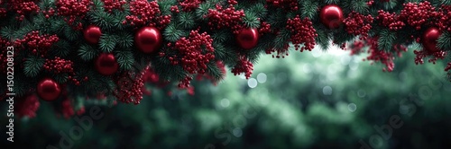Festive Christmas Tree with Red and Green Ornaments in a Forest-Themed Banner