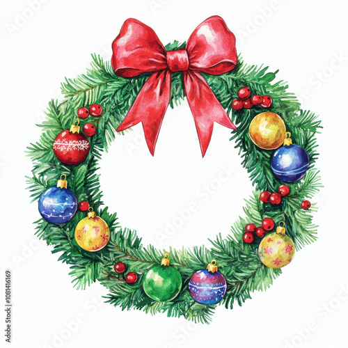 festive Christmas wreath adorned with colorful ornaments and red bow, perfect for holiday decorations