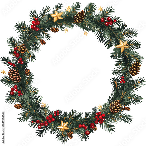 Festive Christmas wreath. Round frame made of conifer branches decorated with cones, artificial red berries and decorative gold snowflakes. Wreath isolated on white background