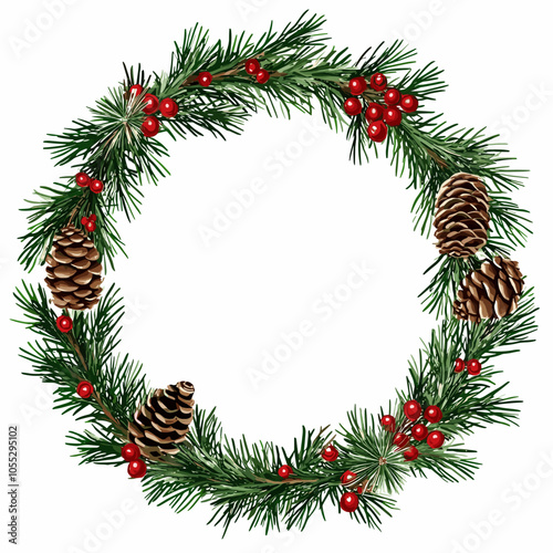 Festive Christmas wreath. Round frame made of conifer branches decorated with cones, artificial red berries and decorative gold snowflakes. Wreath isolated on white background