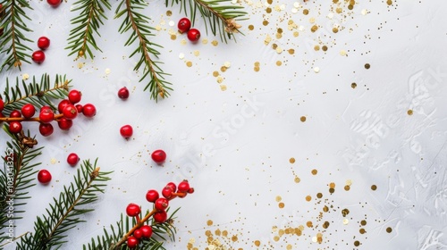 Festive Christmas-themed flat lay with pine branches, red berries, and golden confetti on white table. Perfect for holiday card design, seasonal greetings, and festive decorations.