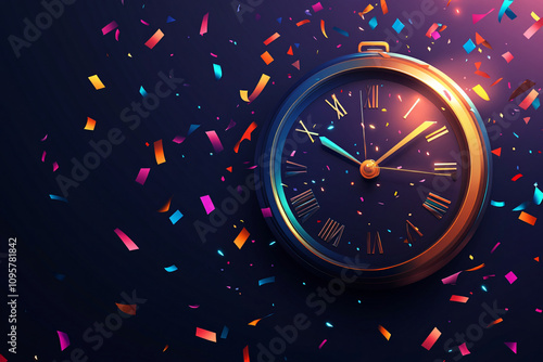 festive clock striking midnight surrounded by colorful confetti, symbolizing celebration and new beginnings. Perfect for New Year’s themes