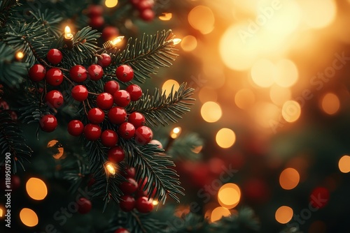 Festive close-up of red berries and evergreen branches with warm bokeh lights.