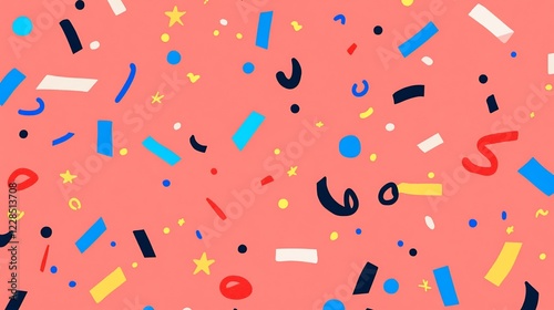 Festive confetti pattern with various shapes on a coral background, creating celebratory texture