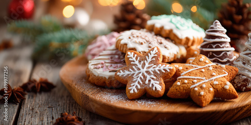 Festive cookies with intricate icing designs are arranged on wooden plate, creating warm holiday theme. background features blurred lights and pine branches, enhancing cozy atmosphere
