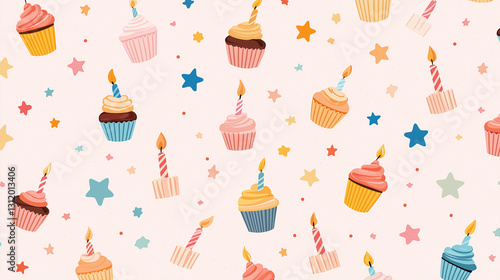 Festive Cupcake Pattern: A joyful, repeating pattern of colorful cupcakes and vibrant stars, perfect for celebratory designs.