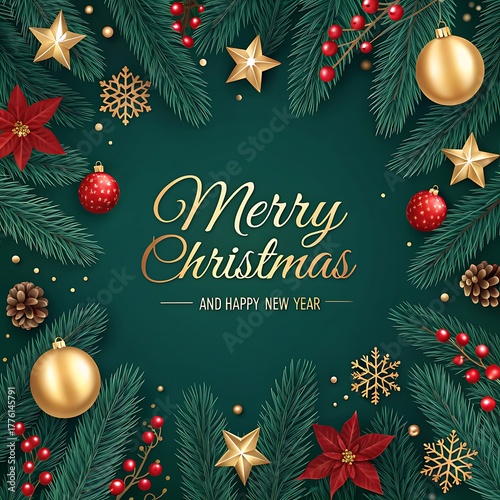 Festive Elegance: Merry Christmas and a Joyful New Year This beautifully designed image captures the magic and elegance of the Christmas season. The rich green background, adorned with lush pine bran