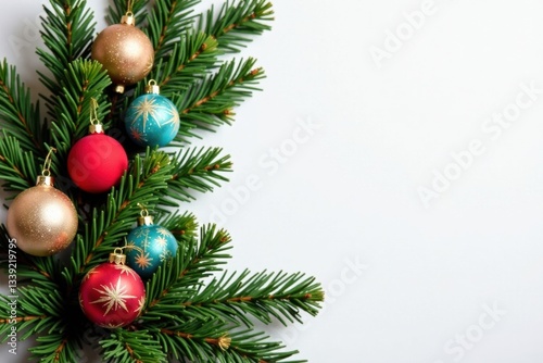 Festive Evergreen Branches Adorned with Sparkling Ornaments on a White Background, Perfect for Holiday Greetings