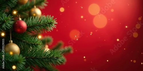 Festive fir branches, golden glitter, bokeh lights, red background , edge, shimmer, frame