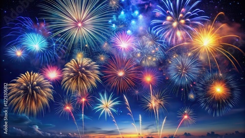 Festive fireworks display over a dark blue sky with vibrant colors and patterns on display at night, colorful