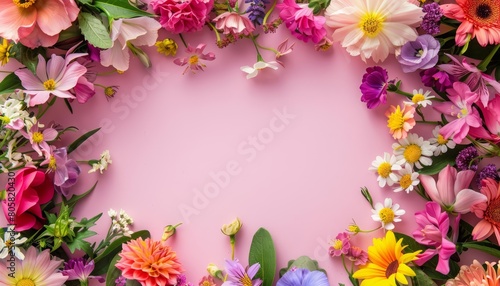 Festive floral frames of bright spring flowers set the scene for a joyful Easter celebration, blank frame template sharpened with large copy space