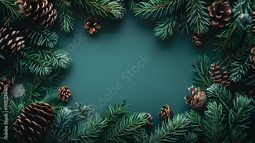 Festive frame of pine branches and cones on teal background.