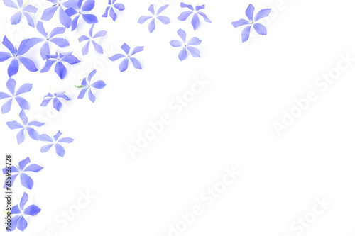Festive frame of tiny blue flowers on a white background.Copy space for text.Floral background for greeting cards