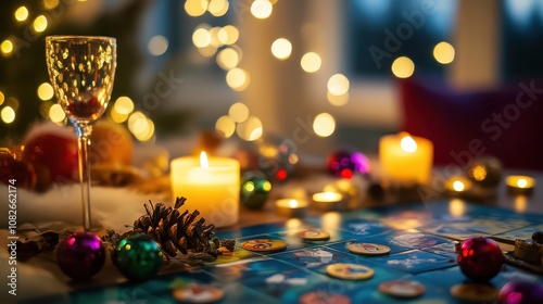 Festive Game Night Setup with Colorful Board, Candles, and Charming Decorations for a Cozy Gathering Atmosphere