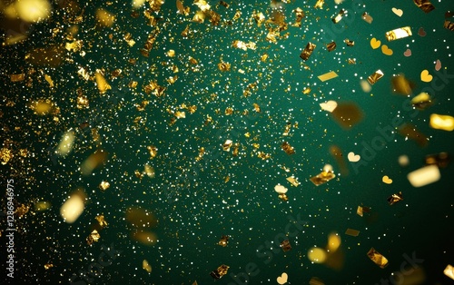 Festive golden confetti explosion on deep green background for Saint Patricks Day