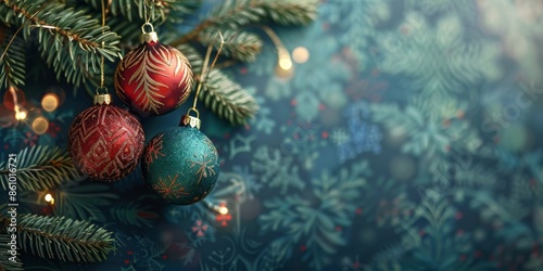 Festive Holiday Cheer: Christmas Greeting Card with Dark Green Pattern, Hanging Pine Balls, and Ample Copy Space