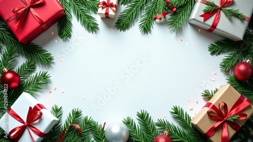 Festive Holiday Frame Featuring Evergreen Branches, Ornamental Spheres, and Wrapped Presents with Red Ribbons on a Light Background