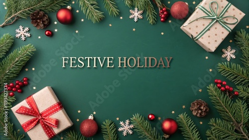 Festive Holiday Green Background Flatlay Composition with Gifts, Pine and Ornaments, Christmas, Winter Christmas, Holiday