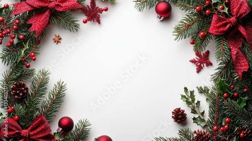 Festive Holiday Wreath Frame Element with Red Bows and Ornaments on White Background for Seasonal Decor